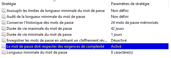 Configuration ordinateur > Stratégies > Paramètres Windows > Paramètres de sécurité > Stratégies de comptes > Stratégie de mot de passe