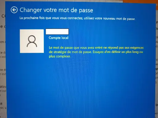 Avez-vous déjà essayé de ne pas mettre de mot de passe sur un compte utilisateur de votre domaine, ou alors de mettre un mot de passe faible (comme "test") ? Le serveur vous répondra avec le message suivant :