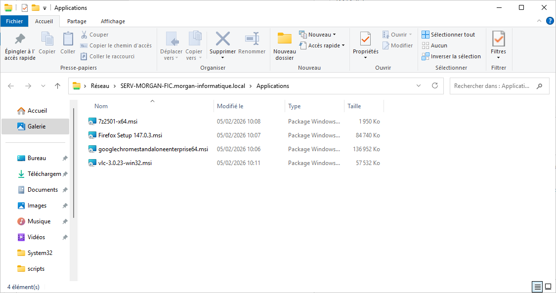 Dans un premier temps, les installations des applications doivent être sur un partage de fichiers réseau accessible aux ordinateurs de votre domaine. Les installateurs doivent être obligatoirement en ".msi" et non en ".exe".