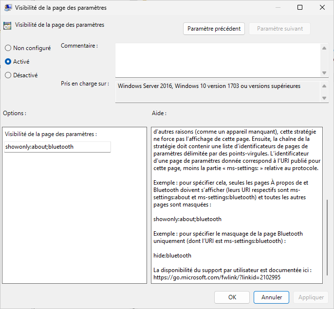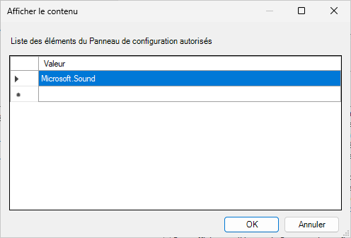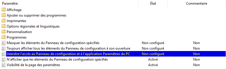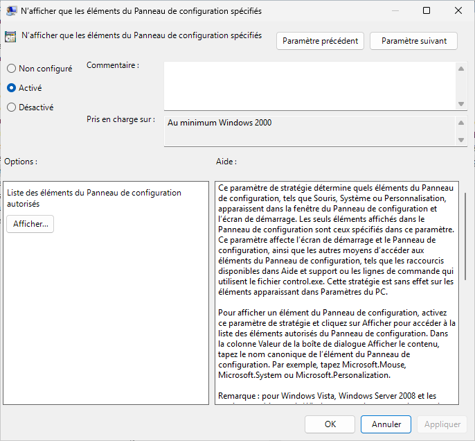 Pour le Panneau de configuration, il y a deux GPO : l'une qui masque les menus et l'autre qui affiche uniquement les menus spécifiés.