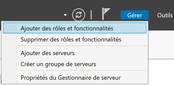 Pour commencer, rendez-vous dans le gestionnaire de serveur et dans "Gérer", "Ajouter des rôles et fonctionnalités".