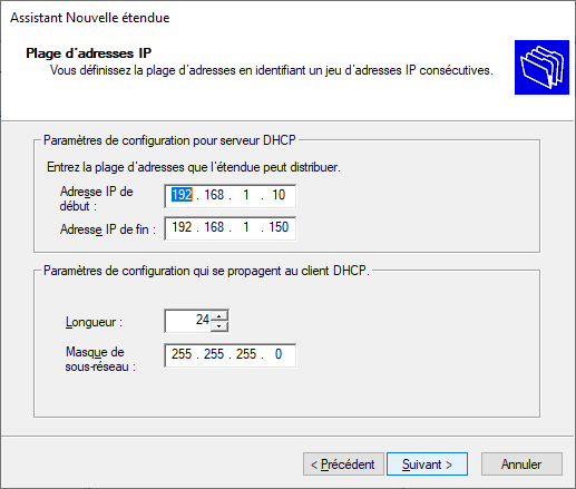 La plage DHCP correspond à la liste des adresses IP que le serveur pourra attribuer. Dans notre exemple, le serveur pourra attribuer des adresses allant de 192.168.1.10 à 192.168.1.150. Il ne pourra donc pas attribuer les adresses 192.168.1.9 ou 192.168.1.151.