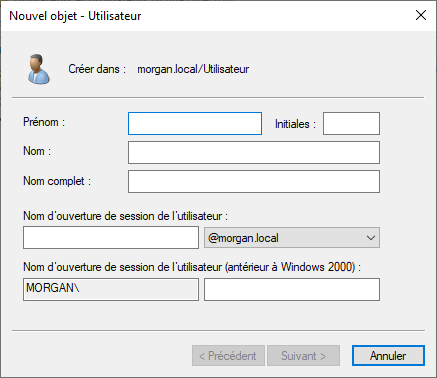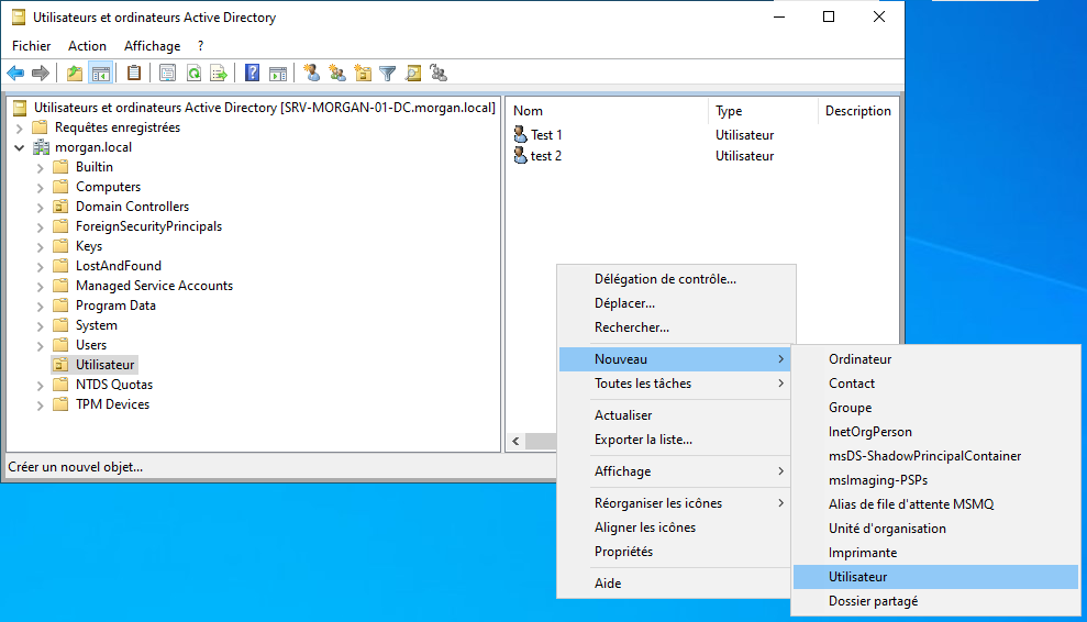 Pour créer des utilisateurs et des ordinateurs, vous devez faire un clic droit dans le dossier et nouvel utilisateur ou ordinateur.